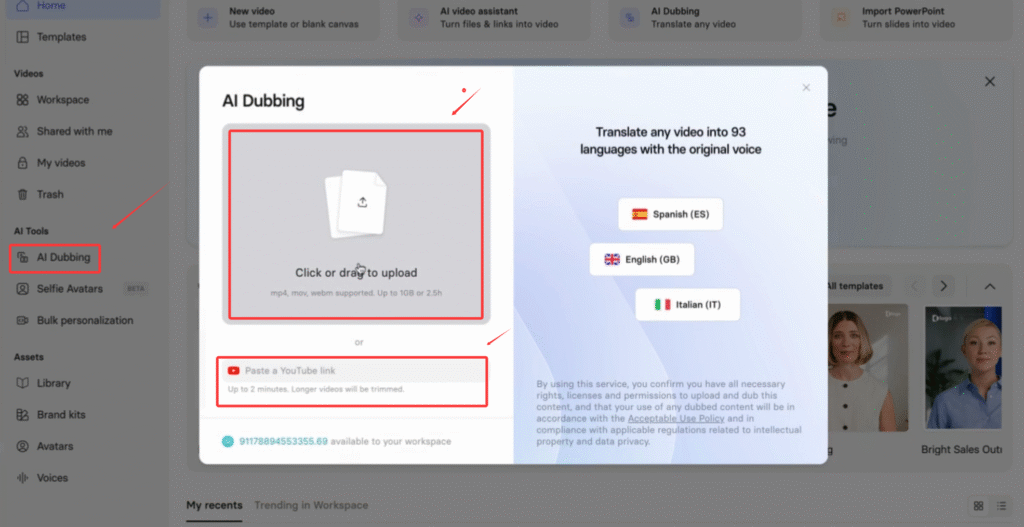 2、通过单击或拖动上传视频文件 – 或粘贴 YouTube 链接