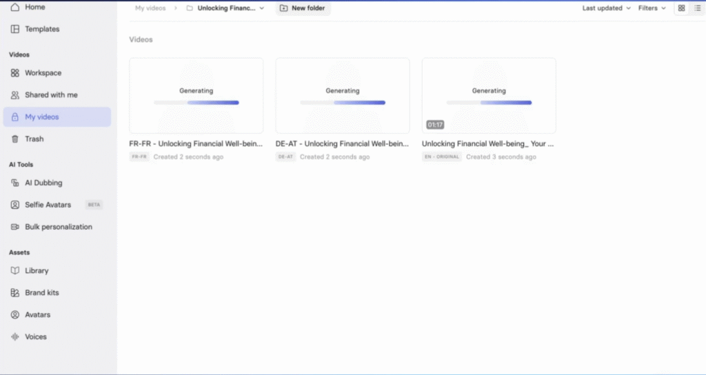 4、点击“生成”。系统会在“我的视频”中创建一个文件夹,其中包含原版和配音版本。